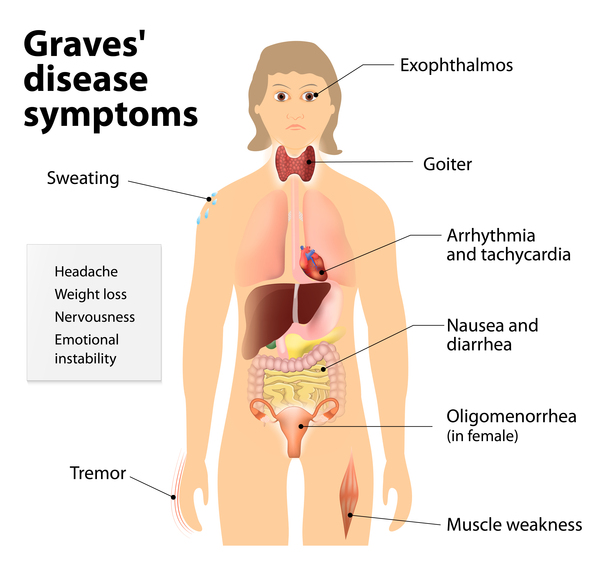 Excess thyroid hormones can cause a variety of signs and symptoms. These include nervousness or anxiety, extreme tiredness (fatigue), a rapid and irregular heartbeat, hand tremors, frequent bowel movements or diarrhea, increased sweating and difficulty tolerating hot conditions, trouble sleeping, and weight loss in spite of an increased appetite. Affected women may have menstrual irregularities, such as an unusually light menstrual flow and infrequent periods. Some people with Graves' disease develop an enlargement of the thyroid called a goiter. Depending on its size, the enlarged thyroid can cause the neck to look swollen and may interfere with breathing and swallowing.