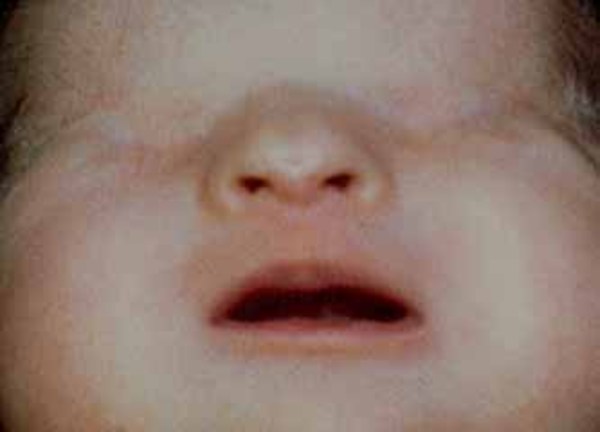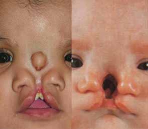 Individuals with Manitoba oculotrichoanal syndrome usually have abnormalities of the front hairline, such as hair growth extending from the temple to the eye on one or both sides of the face. One or both eyebrows may be completely or partially missing. Most people with this disorder also have a wide nose with a notched tip; in some cases this notch extends up from the tip so that the nose appears to be divided into two halves (bifid nose).