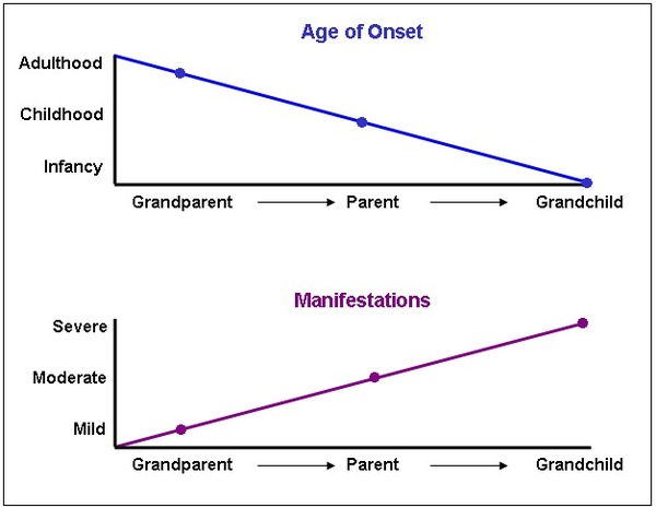 As myotonic dystrophy is passed from one generation to the next, the disorder generally begins earlier in life and signs and symptoms become more severe. This phenomenon is called anticipation. The evidence for anticipation appears only in myotonic dystrophy type 1. In this form of the disorder, anticipation is caused by an increase in the length of the unstable region in the DMPK gene. A longer unstable region in the CNBP gene does not appear to influence the age of onset of myotonic dystrophy type 2.