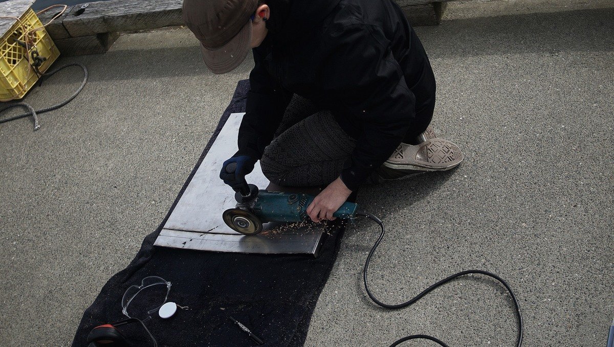 We marked the placement of the hole on deck. The water deck iron requires a 17.78 cm (7 in) cut hole. To make sure the hole was aligned with the interior pipe, we drilled a small leading hole first. This would mark the center of the hole. We measured correctly, the leading hole was perfectly aligned inside. We taped a bag inside to catch some of the dust, then drilled additional holes on the edges so we could fit the jigsaw blade. Then, came time to cut a big gaping hole on Pino's deck—scary!