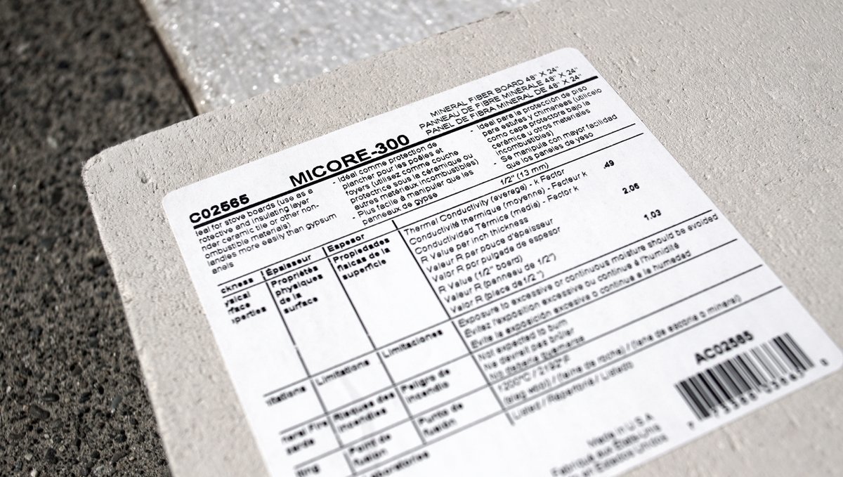 To protect our wooden platform, we bought a 1.27x121x60 cm (0.5x48x24 in) sheet of Micore 300. Micore 300 is a mineral fibre board with an R value of 2.06 per 2.54 cm (1 in), so two 1.27 cm thick layers meet the specifications for our stove.