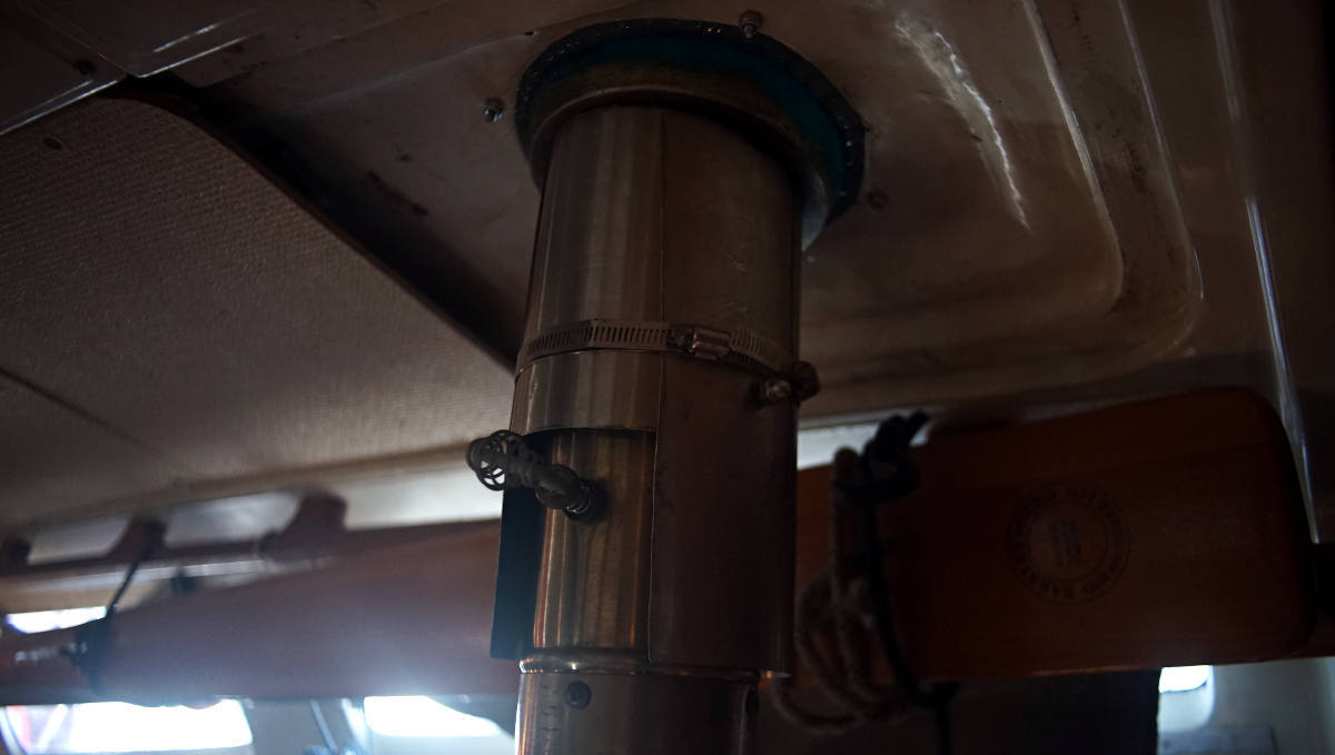 Pino looks great with the conical drum stainless steel smoke head! It is designed to shed rain down the outside of the pipe and into the trough. We won't be sailing with it on deck, we'll swap it out with a rubber bung while underway. The last thing we want is for a line to get caught in it and to send it flying overboard.