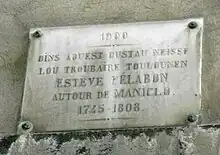 Plate that says in occitan : "In this house the troubadour Etienne Pélabon, Maniclo's author, was born"