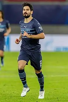 Gündoğan was chosen by his teammates as club captain on 14 August 2022, replacing the departing Fernandinho.[42] On 6 May 2023, he scored both goals in a 2–1 win over Leeds United, which secured his club's 10th league win in a row during the 2022–23 Premier League.[43] On 14 May, Gündoğan scored twice against Everton, one of his goals being a clever flick and the other being a well-taken free kick. Guardiola commented that the player had shown "again and again his quality and his importance".[44] Such performances contributed greatly to City eventually winning in the league title.[1][45]