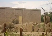 As of November 2023, there are nearly 1,800 animals from 132 species in İzmir Wildlife Park.[8] Swans, ducks and waterfowl are exhibited in the 8,450 m2 pond.[9] There are giraffes, zebras, hippos, ostriches and nyalas in the African savannah, which is built on an area of 18,000 m2.[9][10] Monkeys, velvets and black macaques live in the 6,600 m2 monkey islands, which consists of two islands.[9] Eagles, hawks, vultures and owls are exhibited in the birds of prey section, established on an area of 2,000 m2.[9] The 3,000 m2 Poultry Shelter houses waterfowl, ducks, storks, partridges and ibises.[9] In the section called Children's Zoo, there are small horses, dwarf goats, Cameroon sheep, rabbits, chickens, turkeys, and land and water turtles.[9] Tropical Center, which is the first of its kind in Turkey, is 2,300 m2 in size and has 66 animals from 18 species.[11] Some of these include snakes, lizards, crocodiles, turtles, fish, macaws, marmosets, and fruit bats.[9][10] There is an area of 14,500 m2 for Asian elephants in the park.[9][12] Some of the other mammals found in the park include kangaroos,[13] meerkats, ground squirrels, guinea pigs, coatis, gazelles, fallow deer, red deer, camels, wild goats, hyenas, bears, wolves, lynxes, ring-tailed lemurs, pumas, lions and tigers.[9] Other birds exhibited in the park include white pelican, crested pelican, peacock, pheasant and parrot.[9]