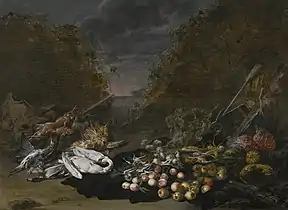 - ↑ Jan van Kessel (ca. 1620-in of na 1661), Stilleven van jachtbuit en vruchten in een landschap at the Netherlands Institute for Art History