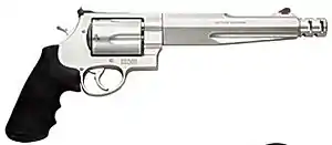 The largest commercially produced revolver: Smith & Wesson Performance Center Model 500 built on the company's X-Frame. This one has a 7.5 inch barrel. Bullet weights for commonly available ammunition vary from 275 to 500 grains; heavier custom cast bullets up to 700 grains for reloading are available.