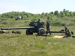 The M1977 can be also used as a field gun at brigade level, as it has a maximum range of 20.6 kilometers. After 1992, the M1977 anti-tank guns were modernized with improved optical sights.[2] The gun can be towed with the DAC 665T truck and has a maximum road speed of 60 km/h on road and 30 km/h off-road.