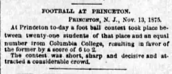 On November 13, Princeton defeated Columbia by a 6–2 score. The New York Herald wrote: "The contest was short, sharp and decisive and attracted a considerable crowd."[3]