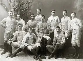 Michigan's lineup against the Harvard club was Harless (center), Fowler, Sprague, Townsend, Knapp, Wade and DeHaven (rushers), Farrand (quarterback), John Duffy (fullback) and MacPherran and J. E. Duffy (halfbacks).[5]