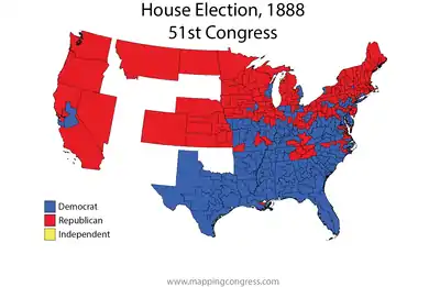 ![]() Map of U.S. House elections results from 1888 elections for 51st Congress on election day (a number of Southern seats were later successfully contested and the results overturned) | |||||||||||||||||||||||||||||||||||||||||||||||||||||||||||