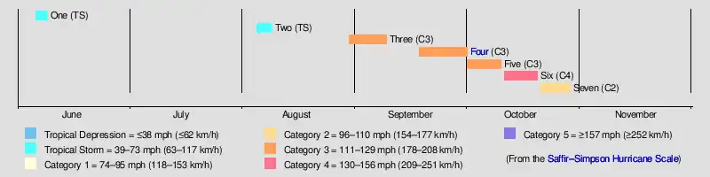 The final storm formed on October 21 and lasted until October 31. It formed far north of the Lesser Antilles and traveled westward towards the Bahamas, but then swerved northeast and out to sea, threatening no land. Its maximum sustained winds peaked at 110 mph (161 km/h).