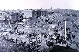 Following the cyclone's destruction, members of Light Battery "A" and the First Regiment were placed on volunteer duty. Within an hour of the tornado striking, 32 members were on duty with ambulances and hospital corps to assist in rescue operations and to help victims. The mayor asked that both commands remain on patrol duty on May 30. Members of the bicycle corps of Company "G" First Regiment assisted when railway service was inaccessible. Telephone and telegraph wires were destroyed and streets were impassable. Officers were summoned to duty by bicycle couriers, as this was the only means of communication.[10] Enough damage was done to the city that there was some speculation that St. Louis might not be able to host the 1896 Republican National Convention in June, just three weeks later, but after a massive clean-up effort, the convention went ahead as planned.