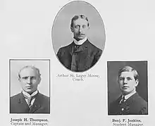 The 1904 football season was a tremendous success both on the field and financially for the Western University of Pennsylvania. Coach Arthur Mosse wrote an in depth article for the December 4 edition of the Pittsburgh Press praising all the people in Pittsburgh who contributed to the team's success. He felt that the Western University athletics would continue to succeed with the foundation he put in place and college sports would become an integral part of the Pittsburgh culture.[14] On December 5 the Athletic Committee met to discuss the state of affairs. They were pleased with the work of and probable retention of coach Mosse for the 1905 season. However, the players demanded that teammate Joe Thompson be given the coaching position. This heated debate spread through the alumni, faculty and student body. The Collegiate and Engineering departments wanted coach Mosse, the Dental and Medical departments were rooting for Joe Thompson.[15] Some faculty and alumni feared the transferring of star players if Thompson left school.[16] No solution was reached at the February 3 meeting of the Athletic Association. Coach Mosse continued working toward the 1905 season by setting up a schedule that was approved at the March 3rd Athletic Association meeting, but the naming of the coach was again put on hold.[17] Chancellor Samuel McCormick and trustee George Clapp decided to intervene for the benefit of the University. At the April 7 Athletic Association meeting the problems were addressed and resolved to the satisfaction of all parties. Coach Arthur Mosse was retained for another year and Joe Thompson was named manager and captain of the team.[18] The team played its home games at Exposition Park in Pittsburgh. In its third season under head coach Arthur Mosse, the team compiled an 11–2 record, shut out ten of its thirteen opponents, and outscored all opponents by a total of 435 to 46.[19][20] Instead of celebrating another successful season on the gridiron, the players again demanded that Coach Mosse not be retained for the 1906 season or they would transfer. And so came another winter of discontent in the Western University Athletic Association.[21][22]