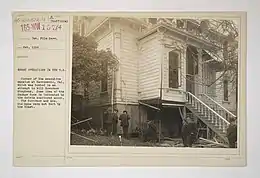 At 11:55 p.m. on December 17, 1917, the Governor and his wife Flora awoke to what they described as a "nervous shock". While no one was injured, including all of the servants, windows were shattered as far as two to three blocks away.[4] When the police arrived, they found Governor Stephens, with little care, wading through the wet, muddy basement in search of a clue as to how the bomb had been placed.[5] While neither he nor his guard had seen the perpetrator nor the act first hand, they both expressed the belief that the bomb had been thrown from an alley running about 40 feet from the rear of the house. As for the motive, Stephens was convinced of it "probably having been done with a view to terrorism, the chief weapon of the alien enemy," a claim likely linked to his recent series of addresses urging support for the war.[4]