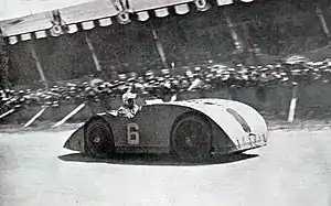 The race was started by Benito Mussolini, the recently appointed Prime Minister and ardent racing fan.[40] Bordino drove despite his broken arm, with his mechanic doing the gear changes but it did not slow him down. He set a blistering pace and led for over half the race until the exhaustion of the effort finally overtook him and he had to retire. Nazzaro took the lead but when he had to stop to refill water with just two laps remaining, Salomano overtook him and held on for the victory.[40] Murphy finished third, his race compromised by the car's lack of traction on the road-circuit portion. This marked the first Grand Prix win for a supercharged car,[35][41] and Salomano's new lap record of 3:46.4 (159.08 km/h) eclipsed Bordino's one of 3:55 (146.9 km/h) from the year before.[42] Although it was his only major triumph, he remained a test-driver for Fiat until the 1960s.[26][12]