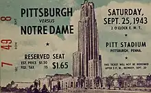 On September 25, Pitt, wearing their red jerseys, opened the season against third-year coach Frank Leahy's Notre Dame Fighting Irish. The all-time series was tied 5–5–1, but the teams had not met since 1937, when Jock Sutherland was coach.[30] Notre Dame had a V-12 Navy College Training Program on their campus and 29 of the 35 men on the travel squad were Navy or Marine trainees. Pitt countered with a squad of freshmen and 4-Fs.[31]