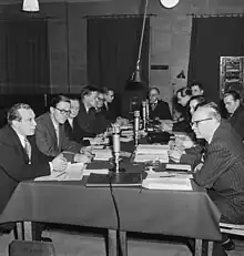 Debaters with their assistants at the Finnish Broadcasting Company's radio studio, sitting around a table for an election debate before the 1954 Finnish parliamentary elections