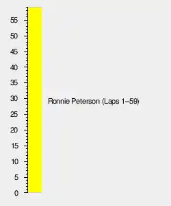 For the last 15 laps, Hunt continued to follow Peterson, between .7 and 1.4 seconds behind. He pulled alongside at one point, but could not finish the pass. "I looked over at Ronnie, and he looked fiercer than me," he explained after the race.