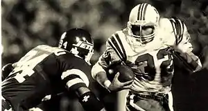 This photo from 1985 shows the Jets’ uniform redesigned and adopted in 1978. Note the green helmet and modified shoulder/sleeve treatment.