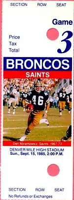 A ticket for a September 15, 1985 game between the Saints and the Denver Broncos.
