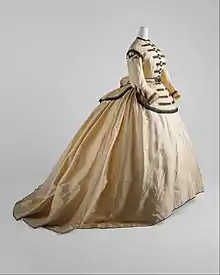 Women's fashion at the beginning of Queen Victoria's reign became more modest – corsets were paired with swelled skirts which aligned with early Victorian ideals of the modest domestic lady stereotype.[19] Layered petticoats with crinoline and steel-hoop structures,.[20][21] Menswear of the early Victorian Era was understated with the rise of the respectable male bourgeois gentleman.[18] However, soon after both men's and women's fashion became more colourful and relaxed with more exuberant styles and new techniques including passementerie trims thanks to increasing availability of the sewing machine.[22] By the latter half of mid-nineteenth century it becomes clear that fashion technologies revolutionised the designs of particularly womenswear fashion with cage crinoline enabling a larger but more lightweight hoop skirt.[23] In align with the trend of offering greater comfort, menswear 'relaxed into wide, easy cuts'.[23]