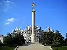 On 4 July, the 2nd Battalion, 16th Infantry,[9] paraded through the streets of Paris to bolster the sagging French spirits. An apocryphal story holds that at Lafayette's tomb, to the delight of the attending Parisians, Captain Charles E. Stanton of the division's 16th Infantry Regiment stepped forward and declared, "Lafayette, nous sommes ici! [Lafayette, we are here!]" Two days later, on 6 July, Headquarters, First Expeditionary Division was redesignated as Headquarters, First Division, American Expeditionary Forces.