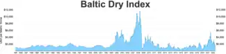 The Baltic Dry Index is a measure of the cost of shipping dry bulk goods around the world. It increased during the mid 2000s because of global demand for manufactured goods initially and in 2008 the price of oil drove the index higher to an all time high of 11,440 points in May 2008. Because of the 2008 recession the index dropped to 715 points in late 2008. [118]