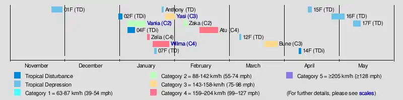 Early on January 19, RSMC Nadi reported that Tropical Disturbance 06F had developed within a trough of low pressure about 665 km (413 mi) to the northeast of Nadi, Fiji.[37] During that day convection surrounding the disturbance gradually became more organized before early the next day, RSMC Nadi reported that it had intensified into a tropical depression.[38] On January 22, The Joint Typhoon Warning Center (JTWC) started monitoring the system as Tropical Cyclone '08P'.[39] Later the same day, RSMC Nadi upgraded Tropical Depression 06F to a tropical cyclone and named it 'Wilma'.[40] Early on January 24, RSMC Nadi further upgraded Wilma to a Category 2 Tropical Cyclone.[41] Late on the same day, RSMC Nadi reported that Wilma had intensified into a Category 3 Severe Tropical Cyclone.[42] Wilma Continued to strengthen and January 26, the RSMC Nadi upgraded it into a Category 4 Severe Tropical Cyclone.[43] Early on January 27, Wilma entered TCWC Wellington's area of responsibility.[44] A few hours later, TCWC Wellington took full responsibility of Wilma, and downgraded it into a Category 3 Severe Tropical Cyclone.[45] Wilma Continued to weaken and TCWC Wellington further downgraded it into a tropical cyclone.[46] On January 28, the JTWC, issuing their final warning, reported that the system took a southeast curve along the coast of North Island, New Zealand and started becoming extratropical.[47] A few hours later, the TCWC Wellington, downgraded it into a low, no longer considering it tropical.[48]