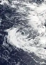 During March 7, Tropical Low 21U developed within the Australian region, about 1,000 km (620 mi) to the northwest of Yeppoon, Queensland.[106] During that day the tropical low moved eastwards and into the South Pacific basin, where RSMC Nadi expected the system to develop into a tropical cyclone and designated it as Tropical Depression 12F during March 8.[107][108] However, during that day as the system was steered south-eastwards into an area of moderate to high wind-shear, atmospheric convection surrounding the system decreased, before it was last noted during March 9.[108][109][110] Tropical Disturbance 14F developed during April 9, near Vanuatu and over the next couple of days moved slowly south-eastwards, before it was last noted during April 11, after convection surrounding the system had failed to organize.[111][112] Tropical Depression 15F developed during April 16, within an area of moderate vertical windshear about 600 km (375 mi) to the east of New Caledonia.[113] During that day the depression moved towards the south-southeast before the final advisory on the system was issued, as it left the tropics and convection surrounding the system started to become unorganized.[114] On April 28, a low-pressure area that had developed within the Australian region, was predicted to develop into a tropical disturbance as it moved into the South Pacific basin.[115] During the next day it was classified as Tropical Depression 16F while it was located near New Caledonia, before it was last noted later that day as it moved out of the tropics.[116][117] The final tropical depression of the season developed during 10 May, within an area of moderate to high vertical windshear, about 155 km (95 mi) to the northeast of Avarua on the Southern Cook island of Rarotonga.[118] Over the next day the depression moved towards the southeast, before it was last noted later that day by RSMC Nadi as it moved into TCWC Wellington's area of responsibility.[119]
