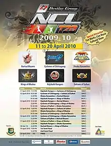The 2010 National Cricket League Twenty20 (Bengali: ন্যাশনাল ক্রিকেট লীগ) tournament in Bangladesh (abbreviated as NCL 1 2010 or the NCL T20 2010), played in April 2010, was the sole edition of a now-defunct Twenty20 league involving the teams in the National Cricket League (NCL). The tournament was initiated by the Bangladesh Cricket Board (BCB). It included six teams representing the divisions of Bangladesh. It was a limited success and has effectively been replaced by the Bangladesh Premier League (BPL). The tournament was won by the Rajshahi Rangers who defeated the Kings of Khulna by 6 wickets in the final at the Sher-e-Bangla National Cricket Stadium in Dhaka, the winning team's Qaiser Abbas being named "Man of the Match".