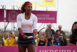 Williams then played at the blue clay courts of the Mutua Madrid Open. In the first round she met Russian Elena Vesnina and won with 13 aces and 40 winners.[19] In the second round she faced another Russian in Anastasia Pavlyuchenkova and swept pass the Russian with a straight sets victory.[20] She then faced Caroline Wozniacki. Having lost their last match-up at Miami, a sluggish start from Williams looked similar to Miami as Wozniacki won the first set easily losing only one game. However, Williams avenged her loss at Miami and got back, winning the next two sets with 43 winners.[21] In the quarterfinals she faced her third Russian opponent in the tournament, Maria Sharapova, with whom she had a 7–2 lead against Sharapova. Williams continued her streak with a victory and 11 aces.[22] In the semifinals she ended the run of Czech qualifier, Lucie Hradecká. The first set was a tight contest with Williams edging Hradecká in the tie-break. The second set was a contrast with Williams winning with a bagel.[23] In the final, she faced world no. 1, Victoria Azarenka, and dominated the match losing only four games in the victory. Williams hit 13 aces in the match and she also improved her record against Belarusian to 7–1. This was her 41st title putting her second in most titles among active players along with Kim Clijsters and behind her sister, Venus Williams, with 43. The win also moved her from 9th to 6th in the rankings.[24][25]