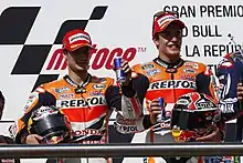 Dani Pedrosa and Marc Márquez, celebrating on the podium after finishing second and first at the MotoGP race.