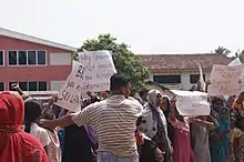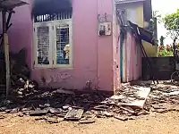 After its rally the BBS drove into Dharga Town chanting anti-Muslim slogans.[22][26] Local residents started throwing stones at the BBS convoy which resulted in violent clashes erupting between the two groups.[27][28] Eyewitnesses reported Muslim homes and a mosque being stoned.[22] Muslims were pulled off buses and assaulted whilst the Buddhist mob threw Molotov cocktails, burning and looting Muslim shops and homes.[22][29][30] Muslim residents were forced to flee from their homes and seek shelter in mosques and community centres.[31] There was rioting in Beruwala as well.[32]