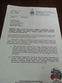 Letter presented by Tanjung Aru Baru village committee chief as evidence for permission granted by the state government to use the jetty.