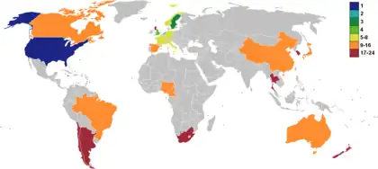The 24 teams were allocated to four pots based on the FIFA Women's World Rankings released on 7 December 2018, with hosts France automatically placed in Pot 1 and position A1 in the draw.[44] Teams from Pot 1 were drawn first and assigned to Position 1. This was followed by Pot 2, Pot 3, and finally Pot 4, with each of these teams also drawn to one of the positions 2–4 within their group. No group could contain more than one team from each confederation apart from UEFA, which have nine teams, where three groups had to contain two UEFA teams.[45][46]