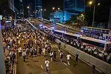 Hundreds of protesters camped in front of the government headquarters well into the night, with more joining them in response to calls from Demosistō and pro-independence activists. Police formed a human chain to prevent protesters from entering Harcourt Road, the main road next to government headquarters, while Special Tactical Squad (STS) stood by for potential conflicts.[73] Although the CHRF officially had called an end to the march at 10 pm, around 100 protesters remained at the Civic Square.[74]