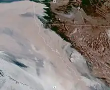 In early September 2020, a combination of a record-breaking heat wave, and Diablo and Santa Ana winds sparked more fires and explosively grew active fires, with the August Complex surpassing the 2018 Mendocino Complex to become California's largest recorded wildfire.[45] The North Complex increased in size as the winds fanned it westward, threatening the city of Oroville, and triggering mass evacuations.[46] During the first week in September, the 2020 fire season set a new California record for the most area burned in a year at 2,000,000 acres (810,000 ha).[47] As of September 13, 3,200,000 acres (1,300,000 ha) had burned in the state.[48] On September 5, heat from the Creek Fire generated a large pyrocumulonimbus cloud, described as one of the largest seen in the United States.[49]