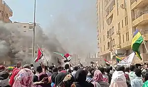 Some gunfire around Khartoum occurred throughout 25 October.[48] According to the Information Ministry, the army used live rounds to disperse the protesters in the 25 October protests.[43] Military forces tried to remove protestors' barricades and attacked civilians.[13] The Central Committee of Sudanese Doctors reports that soldiers fired on protestors outside the Sudanese army headquarters in Khartoum, killing at least three people and injuring more than 80 people.[48] Seven civilians were killed and over 140 injured during the protests.[15][52] Military forces as well as gangs of thugs in plainclothes beat demonstrators in the street, with some being severely injured, and others being injured by cars driven into demonstrators.[53] Medical personnel in Khartoum reported rebuffing demands from gun-wielding soldiers to hand over wounded demonstrators to them.[53] Security forces conducted house-to-house arrests of protest organizers.[54] The Socialist Doctors' Association stated that the Royal Care hospital near army headquarters was in "urgent need of blood". Three hundred protestors were arrested.[14]