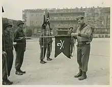 Lt. General Mark W. Clark pins a battle streamer on the guidon of Co. G, 3rd Battalion, 504th Parachute Infantry Regiment which is held by Pvt. Harold T. Williams, Long Beach, California, April 8, 1944.