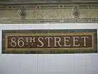 The walls along all four platforms are clad with white ceramic tiles. The ceramic tiles were installed during the early-2000s renovation and are raised about 1⁄4 inch (6.4 mm) from the original layer of tile. At the top of each wall is a colored mosaic frieze consisting mostly of yellows and browns.[6]: 4 Small "86" tablets in a circle run along this frieze.[6]: 4 [44] The name tablets have "86TH STREET" in a white serif font on a reddish-brown background with a buff-colored inner border and green outer border.[6]: 4 [45] Similar tile signs reading "DOWNTOWN TRAINS" and "UPTOWN TRAINS", accompanied by white arrows, are on the walls.[6]: 4 At the extreme southern ends of all four platforms, there are tan terracotta blocks and a darker trim line with "86TH ST" written on it in white sans serif font at regular intervals.[6]: 5