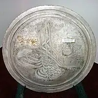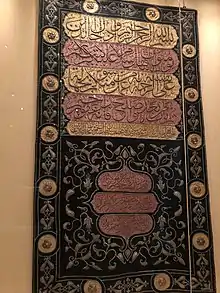 An example of what once hung on the Door of Repentance of the Ka'ba in 1897 until 1898. It was made in Egypt under Abdul Hamid II's ruling of the Ottoman Empire. His name is stitched into the fifth line following a verse from the Qur'an.[28]