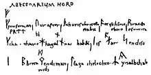 The Abecedarium Nordmanicum is on the same page as the Abecedarium anguliscum (the Anglo-Saxon runes). There are interlineal glosses for some of the runes specific to the Younger Futhark, giving their Anglo-Saxon phonetic equivalents: hagal is glossed with haegl, ar with ac, man with man, and yr with yr. The content of the poem are the names of the runes, connected by a few additional alliterating words as mnemonical aids. For the r, m and l runes, the Anglo-Saxon names are given rather than the Scandinavian ones, as rat, man and lagu for reidh, madr and logr, respectively. The Anglo-Saxon runes ᚹᚱᛠᛏ (wreat) written underneath the feu forman of the first line. It is not clear whether they should be considered part of the poem's text.