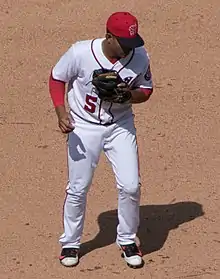 After starting the 2017 season with Double-A Harrisburg, hitting .250 with a home run and three RBIs,[2] Sánchez moved up to Triple-A Syracuse. He had spent a decade in the Washington Nationals organization without ever being added to the 40-man roster or receiving an invitation to major-league spring training[3] when, following an injury to Nationals starting shortstop Trea Turner on June 29, 2017, he was promoted from Syracuse to take Turner's place on the roster. At the time, he was hitting .259 at Syracuse with four home runs and 18 RBIs.[4] He made his major league debut on June 30 against the St. Louis Cardinals, pinch-running for Stephen Drew and playing shortstop for one inning.[5] On July 1, Sánchez got his first major league at-bat as a pinch-hitter with the bases loaded and the Nationals trailing by a run with two outs in the ninth inning. After working the count full against Cardinal's reliever Matt Bowman, Sánchez took a pitch well outside, believing it was ball four for what would have been a game-tying walk. However, umpire Manny Gonzalez called it strike three to end the game.[6] On July 7, inserted on a double switch to play shortstop in the tenth inning, Sánchez lined a single up the middle off reliever Ian Krol of the Atlanta Braves for his first MLB hit. He came around to score as the Nationals walked off the Braves on a single by Daniel Murphy, his first MLB run.[7]