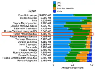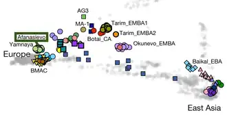 The analysis of the full genome of Afanasievo individuals has shown that they were genetically very close to the Yamnaya population of the Pontic–Caspian steppe.[8][46][47] The Afanasievo and Yamnaya populations were much more similar to each other than to groups geographically located between the two (which unlike Afanasievo samples carried a large amount of ancestry from eastern Siberian hunter-gatherers). This indicates that the Afanasievo culture was brought to the Altai region via migration from the western Eurasian steppe, which occurred with little admixture from local populations.[47][48]