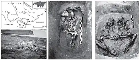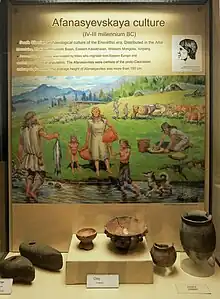 The Afanasievo culture, or Afanasevo culture (Afanasevan culture) (Russian: Афанасьевская культура Afanas'yevskaya kul'tura), is an early archaeological culture of south Siberia, occupying the Minusinsk Basin and the Altai Mountains during the eneolithic era, c. 3300 to 2500 BCE. It is named after a nearby mountain, Gora Afanasieva (Russian: Гора Афанасьева, lit. 'Afanasiev's mountain') in what is now Bogradsky District, Khakassia, Russia, first excavated by archaeologist Sergei Teploukhov in 1920-1929.[9] Afanasievo burials have been found as far as Shatar Chuluu in central Mongolia, confirming a further expansion about 1,500 km beyond the Altai mountains.[5] The Afanasievo culture is now considered as an integral part of the Prehistory of Western and Central Mongolia.[10]