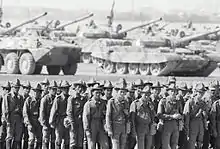 The talks did not succeed in reconciling the government and the mujahideen, though it was noted that they increased the government's popularity among urban areas, stabilized the armed forces and led to a round of defections from disillusioned mujahideen fighters to government militias.[28] Despite this, the only insurgent group to fully reconcile with the government was the Shia-dominated Afghan Hizbullah. A mujahideen boycott of the 1988 elections, which were the first-ever Afghan elections to allow competing political parties, foiled Najibullah's attempt to reconstruct the nation's parliament, who in turn ordered 50 seats be left vacant to offer to the mujahideen if they decided to reconcile at a later date. Moreover, though Najibullah presented himself personally as a pious Muslim and restored the legal status of Islam, his government was unable to acquire the same Islamic credentials that the mujahideen forces wielded, which in turn meant that many of his reforms were not nearly as successful at convincing the devout, conservative rural and tribal population as Najibullah had hoped.[29] Most importantly, Najibullah oversaw the withdrawal of Soviet forces from Afghanistan. The withdrawal was to be done according to the Geneva Accords, which entailed a full removal of Soviet forces from Afghanistan in exchange for the end of American and Pakistan support to the mujahideen.[30]