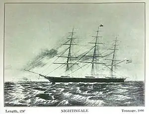 The 1,066 ton clipper ship USS Nightingale originally sailed as part of the American merchant fleet as Nightengale of Boston in China, before trade in that region became unprofitable during the 1850s. She then became a known slave ship until being seized at St. Thomas on January 14, 1861, by the sloop-of-war USS Saratoga. Saratoga's Captain later described the slaver;