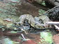 The eastern cottonmouth (Agkistrodon piscivorus piscivorus)[4][5] was once classified as a subspecies of the cottonmouth (Agkistrodon piscivorus). However, DNA based studies published in 2008 and 2015, revealed no significant genetic difference between the eastern cottonmouth (Agkistrodon piscivorus piscivorus) and the western cottonmouth (Agkistrodon piscivorus leucostoma) and synonymized the two subspecies (with the oldest published name, A. piscivorus, having priority). The resulting taxonomy does not recognizes the eastern cottonmouth (A. p. piscivorus) as a valid taxon.[7][8] Several subsequent reviews and species accounts have followed and supported the revised taxonomy.[9][10]:437 p.[11] Information on this snake can be found in the Agkistrodon piscivorus article.