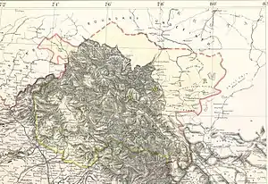 Ladakh was conquered in 1842 by the armies of Raja Gulab Singh (Dogra) under the suzerainty of the Sikh Empire.[23][24] The British defeat of the Sikhs in 1846 resulted in the transfer of the Jammu and Kashmir region including Ladakh to the British, who then installed Gulab Singh as the Maharaja under their suzerainty. The British appointed a boundary commission headed by Alexander Cunningham to determine the boundaries of the state. Chinese and Tibetan officials were invited to jointly demarcate the border, but they did not show any interest.[25] The British boundary commissioners fixed the southern part of the boundary up to the Chang Chenmo Valley, but regarded the area north of it as terra incognita.[26]